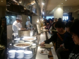 目の前であつあつ出来立ての料理を出してくれるライブパフォーマンスが大好評のホテル「ヴェルデュール」で約40種がビュッフェスタイルで食べ放題。料理は大好評でした。