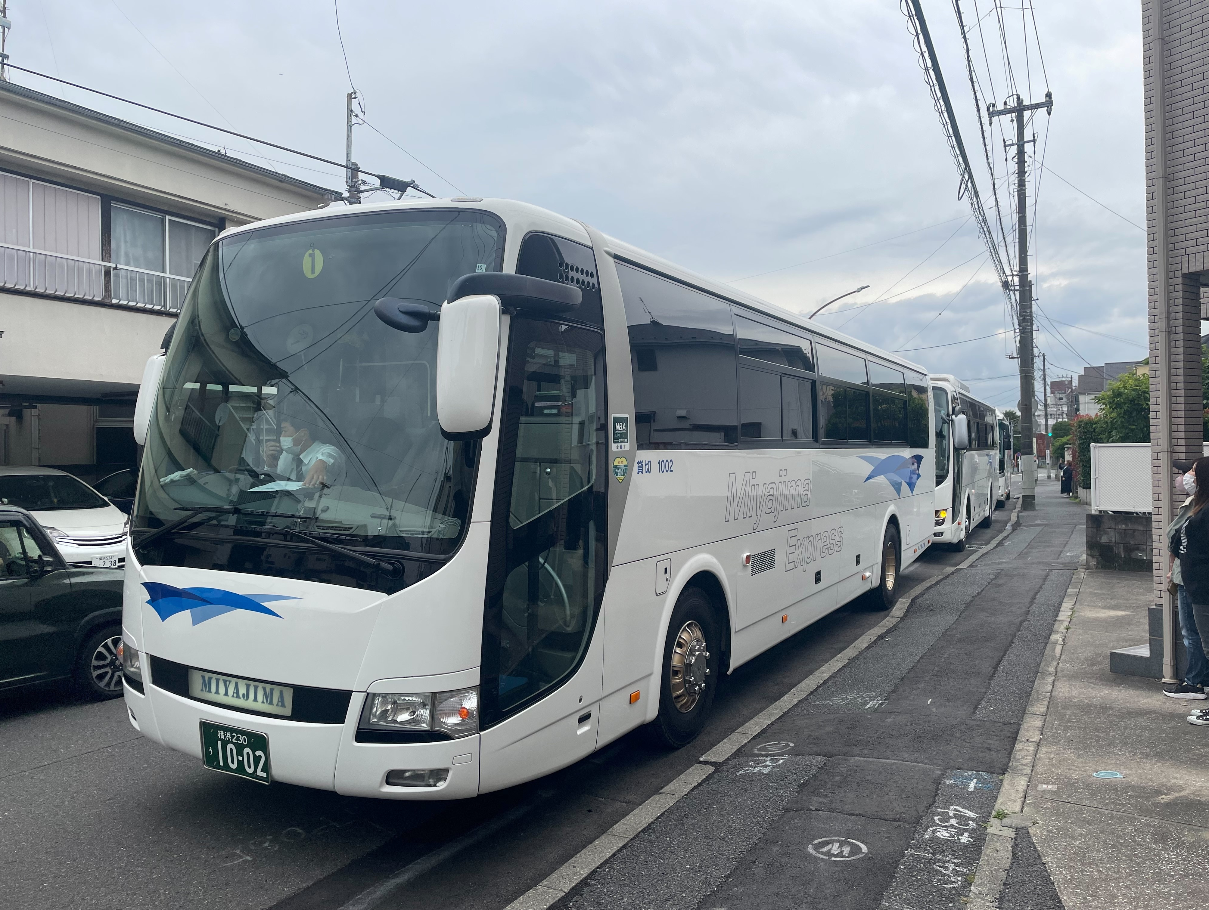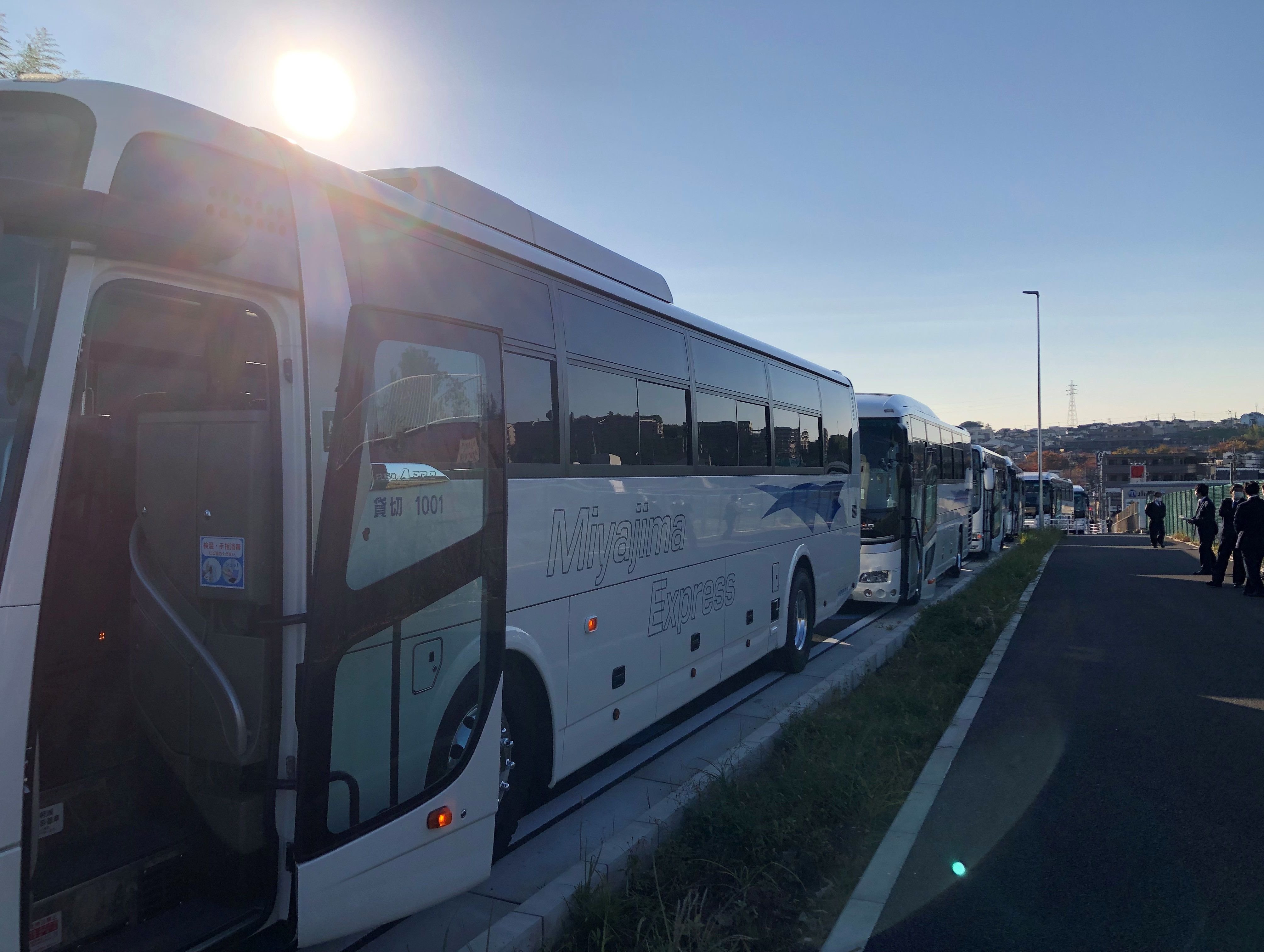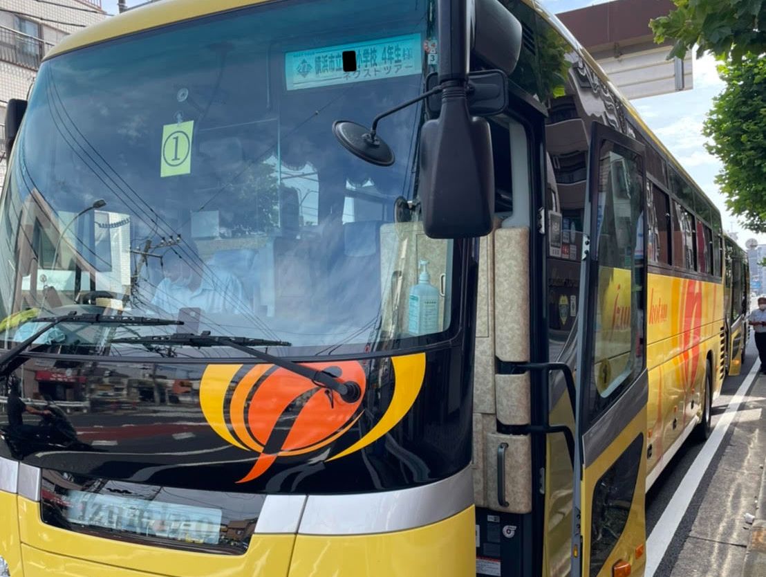 観光バス2台で出発!感染対策を行いながら新江の島水族館へ移動しました。到着時間が少し遅れましたが、無事イルカのショーをご覧いただけました。