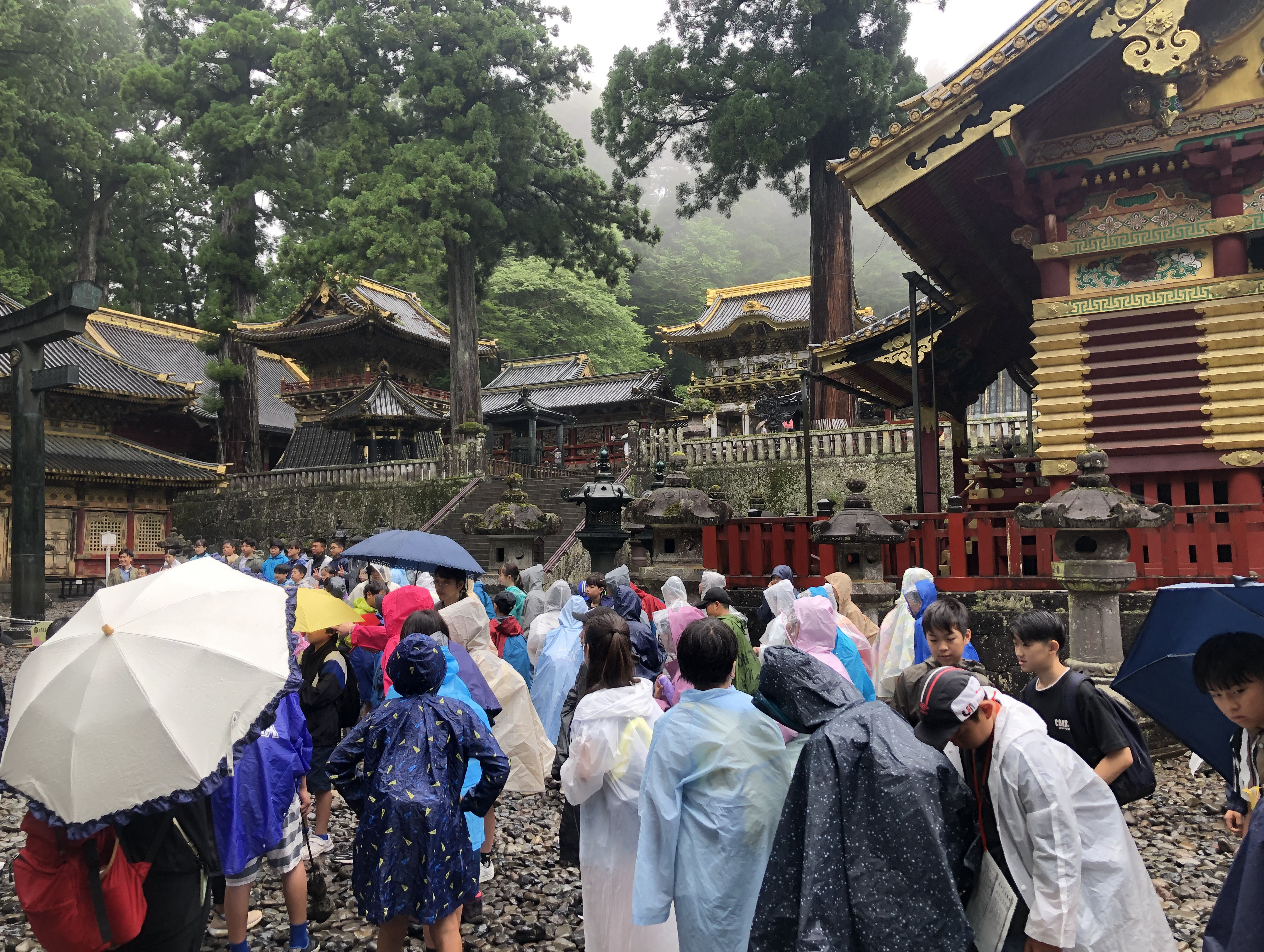 大型バス3台で出発!楽しみに待った修学旅行。1日目は「足尾銅山」に行き、トロッコに乗って東洋一の銅山を見学しました。「いろは坂」を抜けて「湯滝」をみんなで見学。高さ70m、最大幅25m。華厳の滝と竜東の滝と並んで奥日光三名瀑の一つとされています。本日の宿泊ホテルは「日光グランドホテル」です。とてもきれいなホテルで、児童の皆さんも喜んでいただけました。2日目は「輪王寺」「日光東照宮」「華厳の滝」を3か所見学しました。2日目の天候が雨だったので、児童の皆さんびしょぬれになりながらも、楽しんでいただけた様子を見れてよかったです。素敵な思いでが作れてよかったですね。