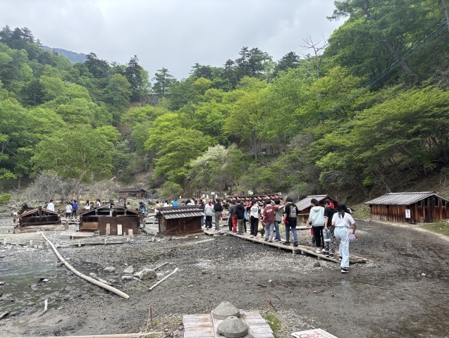 大型バス2台で出発!1日目は中津川でマス🐟のつかみ取り体験をしました。取った魚はその場で調理して塩焼きに!次にレインボープラザで藍染体験。オリジナルのハンカチが出来ましたね。愛川ふれあいの村では、キャンプファイヤーを楽しみました。